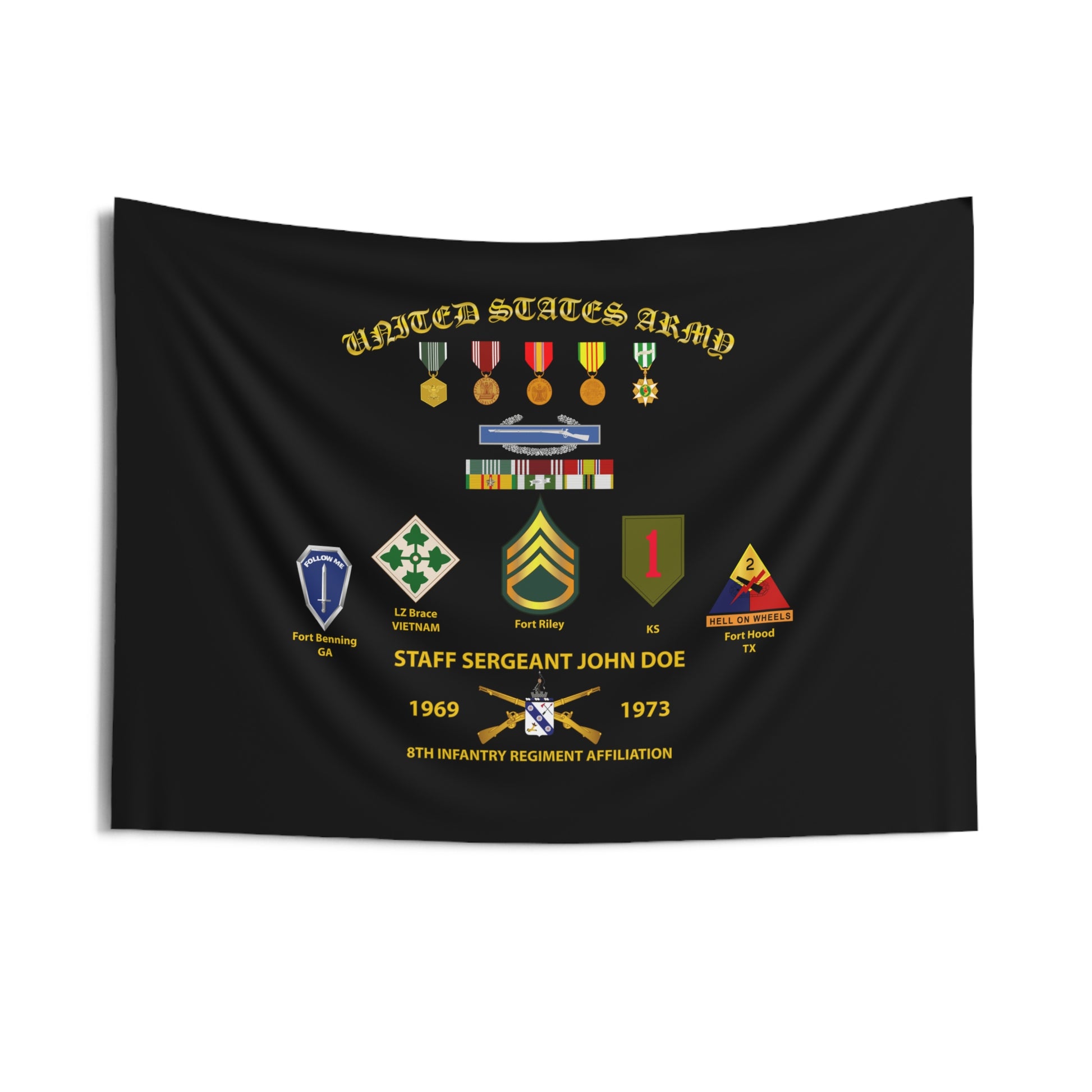 Indoor Wall Tapestries - Personal Shadow Box - Your Career in Graphics Tapestry It's Simple. Provide us the info for your personal Shadow Box Tapestry. Service> Army, Navy, etc. Up to 5 Medals: > ARCOM, RVNCM, VCM, etc. Up to 15 Ribbons > Same as above but up to 15 Badges> CIB, Basic US Jump Wings, Expert Marksman Etc. Rank> SP/4, SGM, 1LT, CPT Etc. SSI> Shoulder Patch and location served Name> What do you want shown Dates Served> From - To Branch or Branches Served> Infantry, Armor, Signal Etc. Regimental Affiliation> 8th Infantry, 2nd Armor Etc. Do you want it dedicated or in Memory of someone? (Folded Flag Design Added) If you want some information other than whats listed - just ask Please include Phone Number for ensured delivery. A great gift for Veterans day or any holiday for a veteran ======================= A custom wall tapestry is a surefire way to uplift any room’s aesthetics with a personal touch. This 100% Polyester wall tapestry comes with hemmed edges for extra durability while its mildew and water-resistant properties ensure years worth of decorating bliss. The advanced tapestry printing techniques guarantee crisp detail even for the craziest of designs, in any of our multiple size choices. .: 100% Polyester .: Water and mildew resistant .: Multiple sizes (26x36 in, 51x60 in, 68x80 in, 88x104 in)